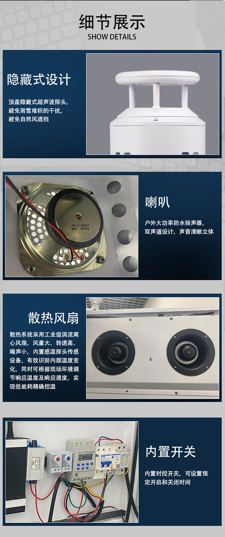 9、散热系统采用工业级涡流离心风扇,风量大、转速高、噪声小,内置感温探头传感设备,有效识别内部温度变化,同时可根据现场环境调节响应温度及响应速度,实现低能耗精确控温