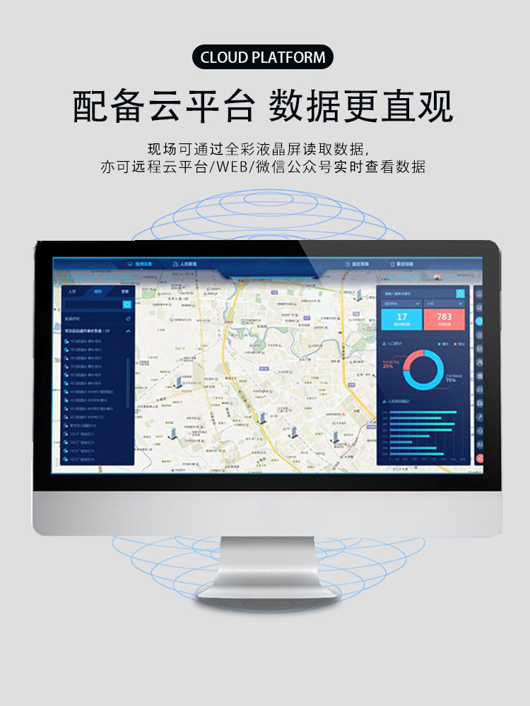 现场可通过全彩液晶屏读取数据,亦可远程云平台/WEB/微信公众号实时查看数据