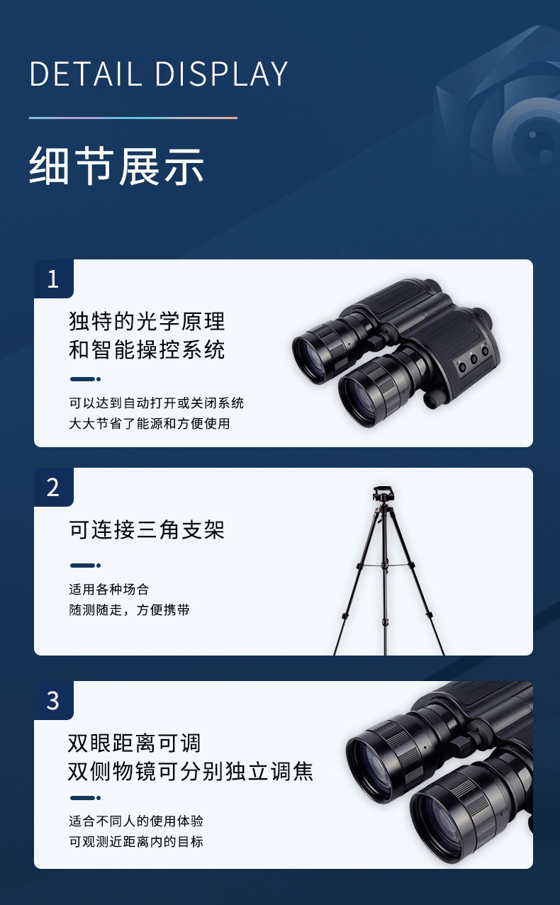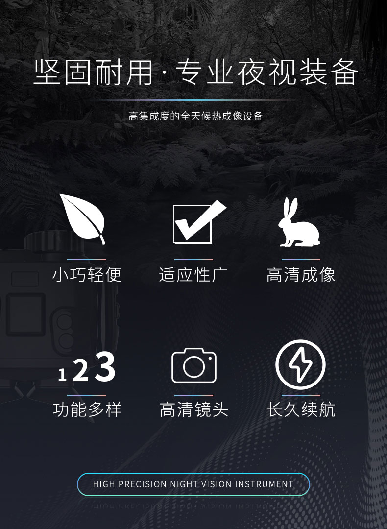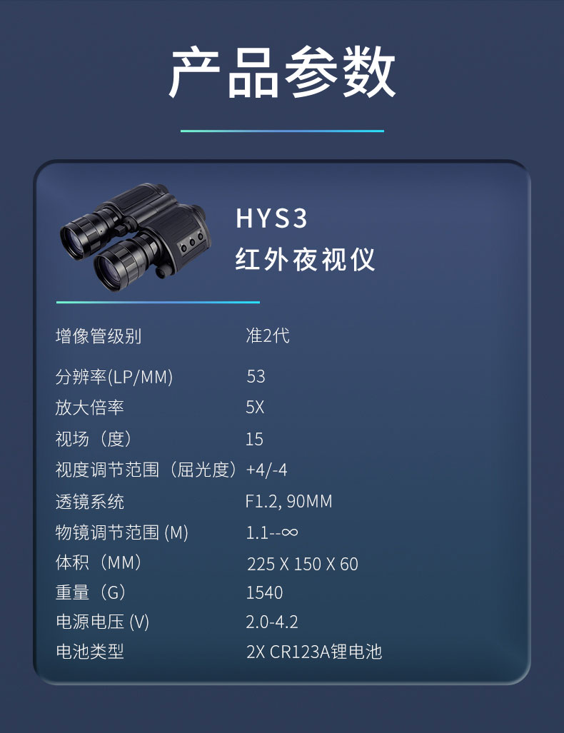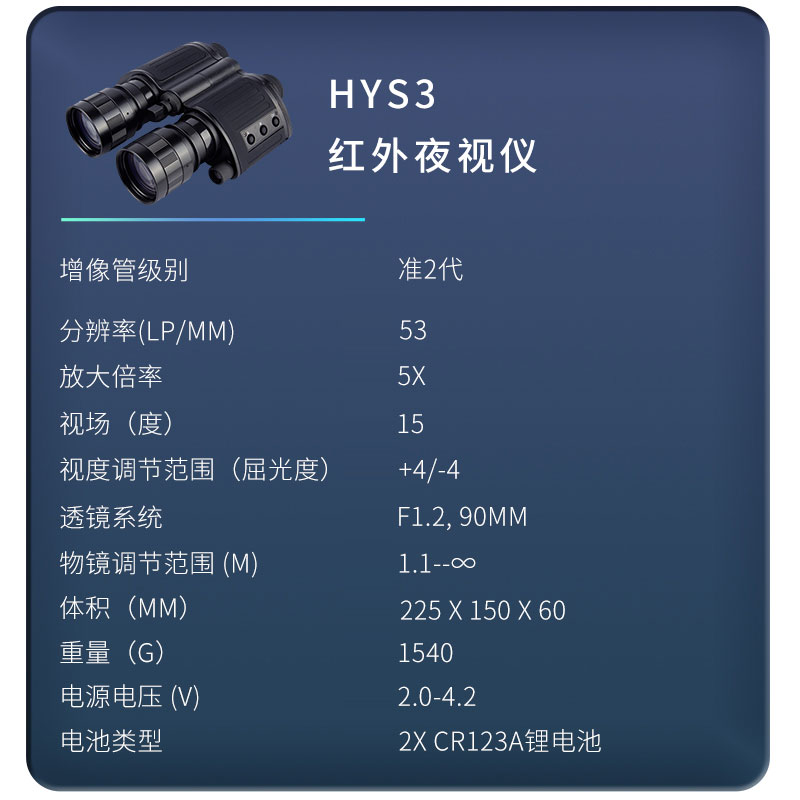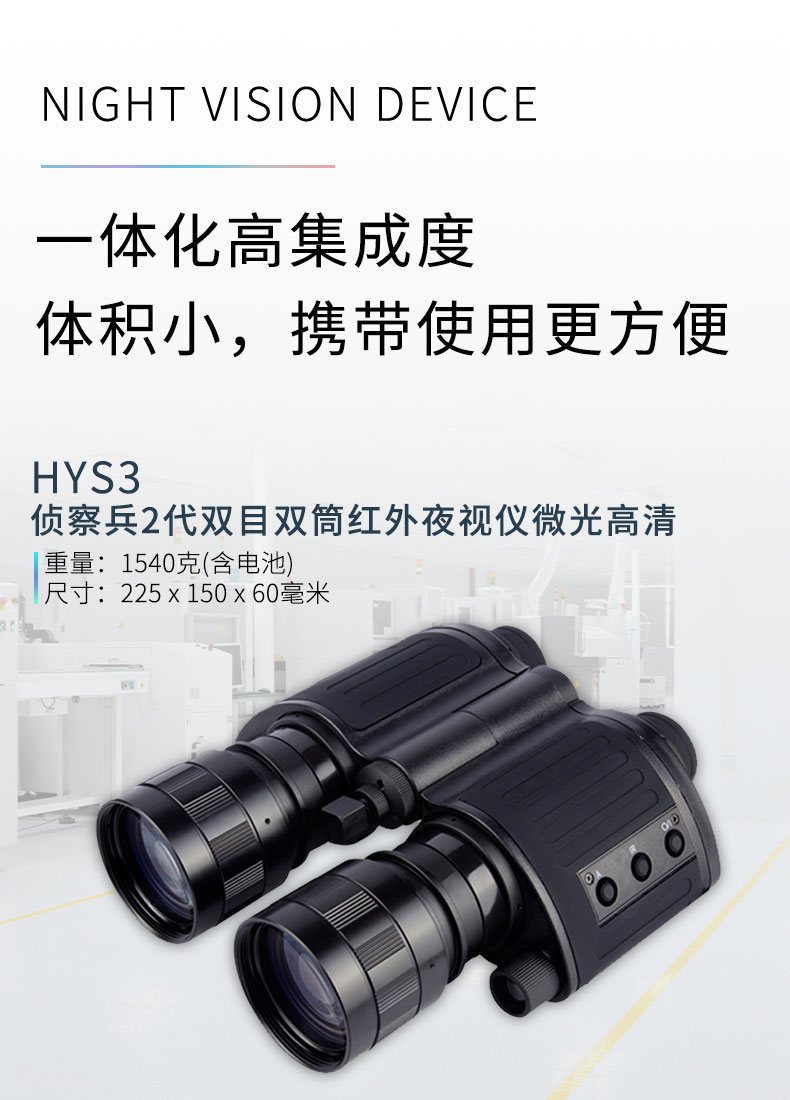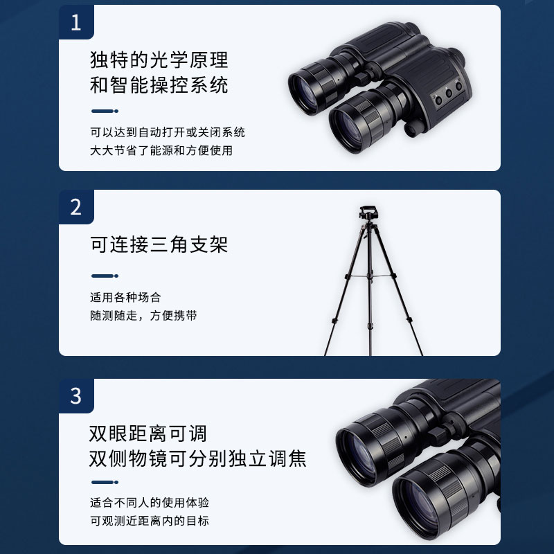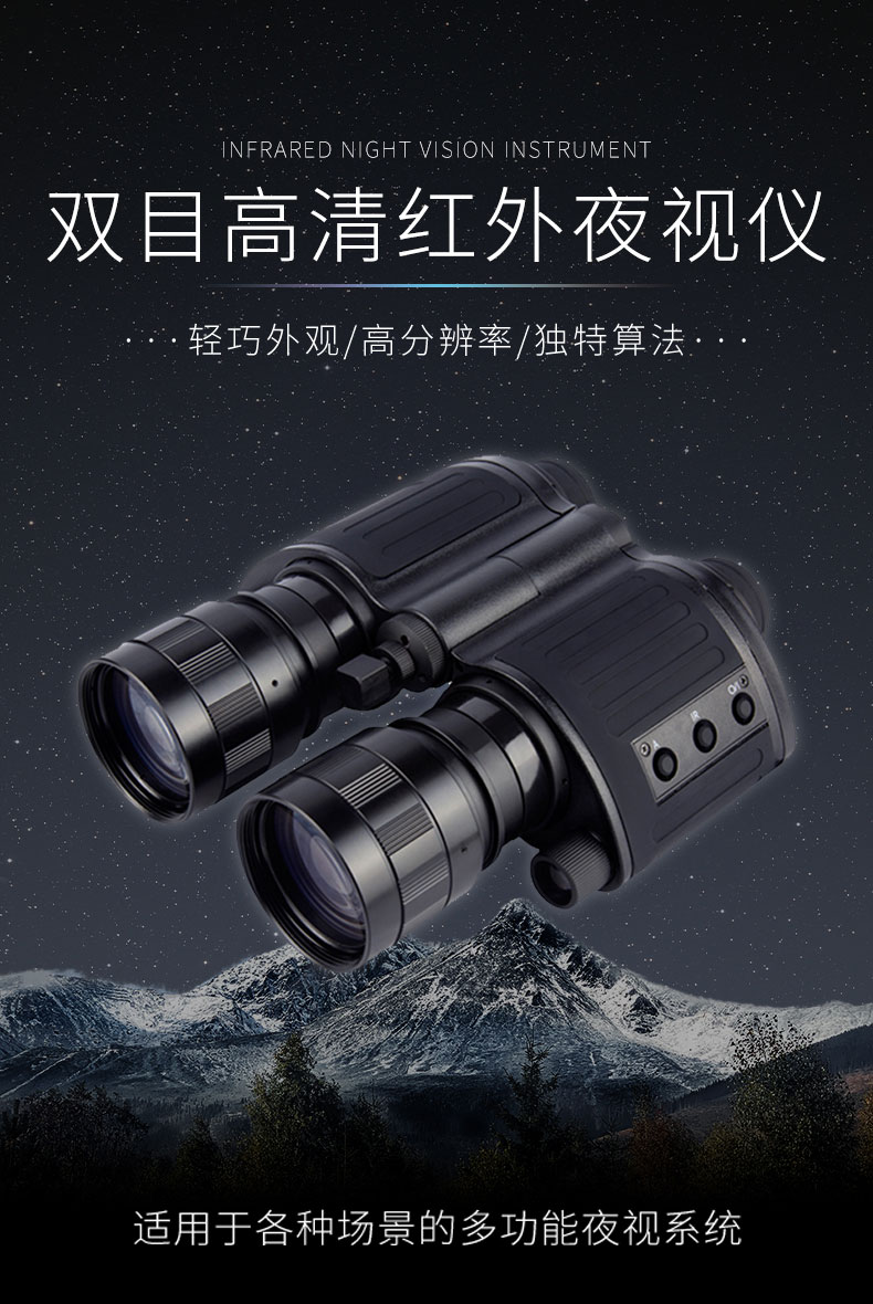 更大的突出特点在于可以近距离聚焦。5倍的放大倍率,更高透光性的物镜系统,35,000倍的放大亮度和准2代的增象管,使观看到的目标更加清晰。智能操作开关系统,避免在长时间使用的时间内重复的开关仪器,非常人性化的设计。双眼距离可调,适合不同人的使用体验。可连接三角支架进行定点观看使用,也可以连接相机或者手机进行视频图像的采集。FT-HYS3作为目前万元以内的双目双筒红外夜视仪性价比更高的一款产品,不仅继承了传统军工坚固耐用的特点,而且做工更见精良。受到了越来越多户外夜间观察爱好者的认可和青睐。