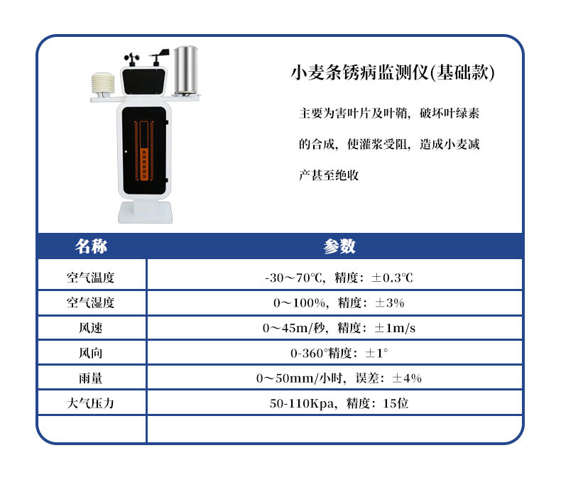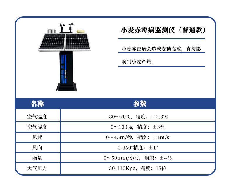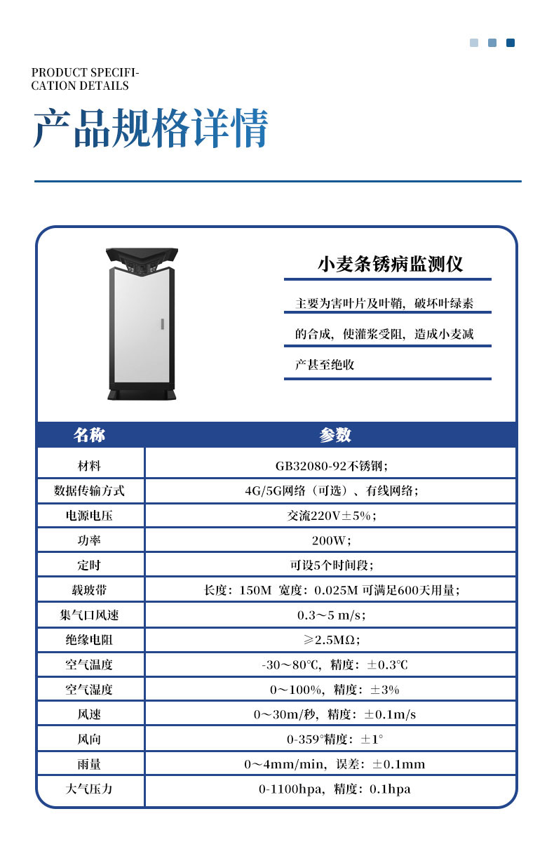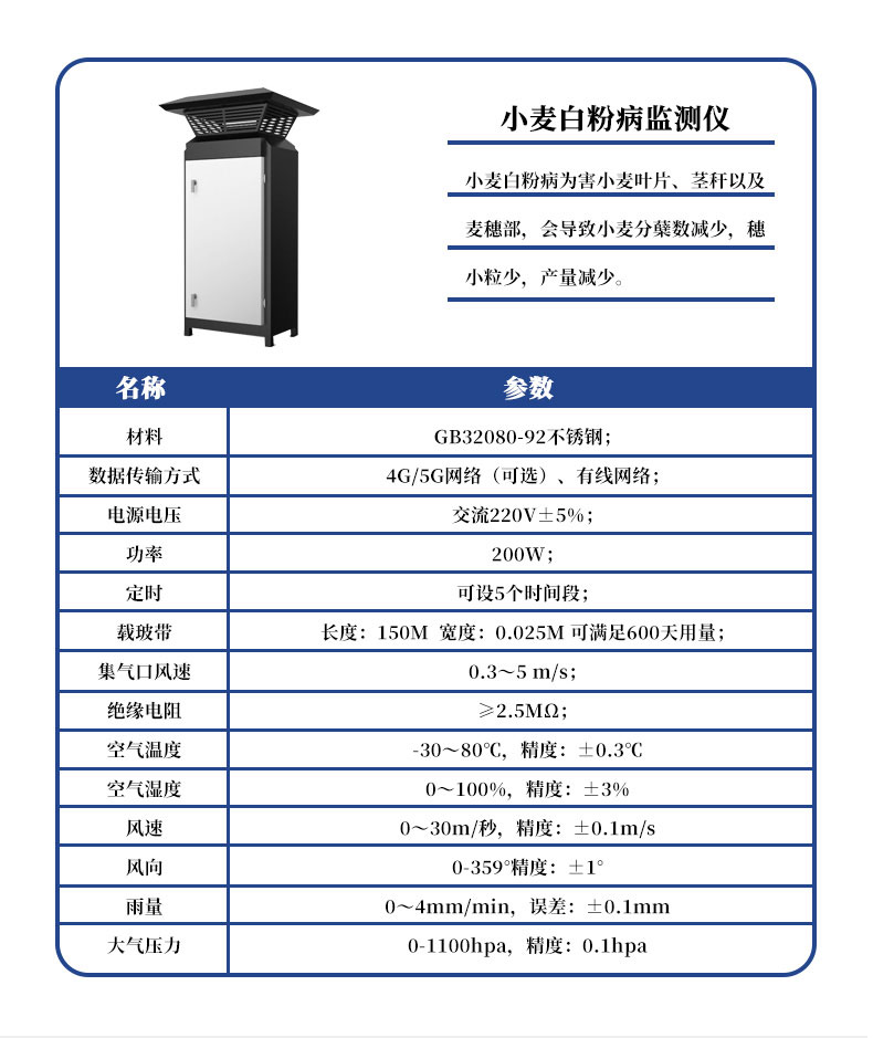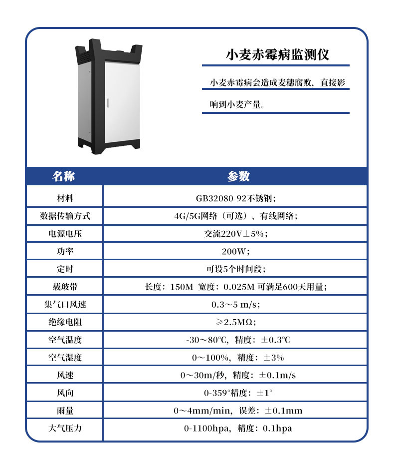 【产品简介】一、小麦赤霉病监测仪简介:小麦赤霉病会造成麦穗腐败,直接影响到小麦产量。小麦赤霉病监测仪是集气象监测和智能孢子捕捉显微成像于一体的新型赤霉病监测装备。系统通过采集小麦种植区的生长环···