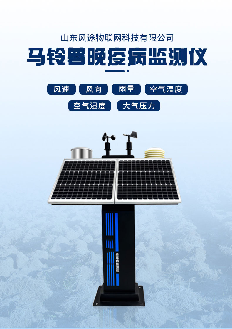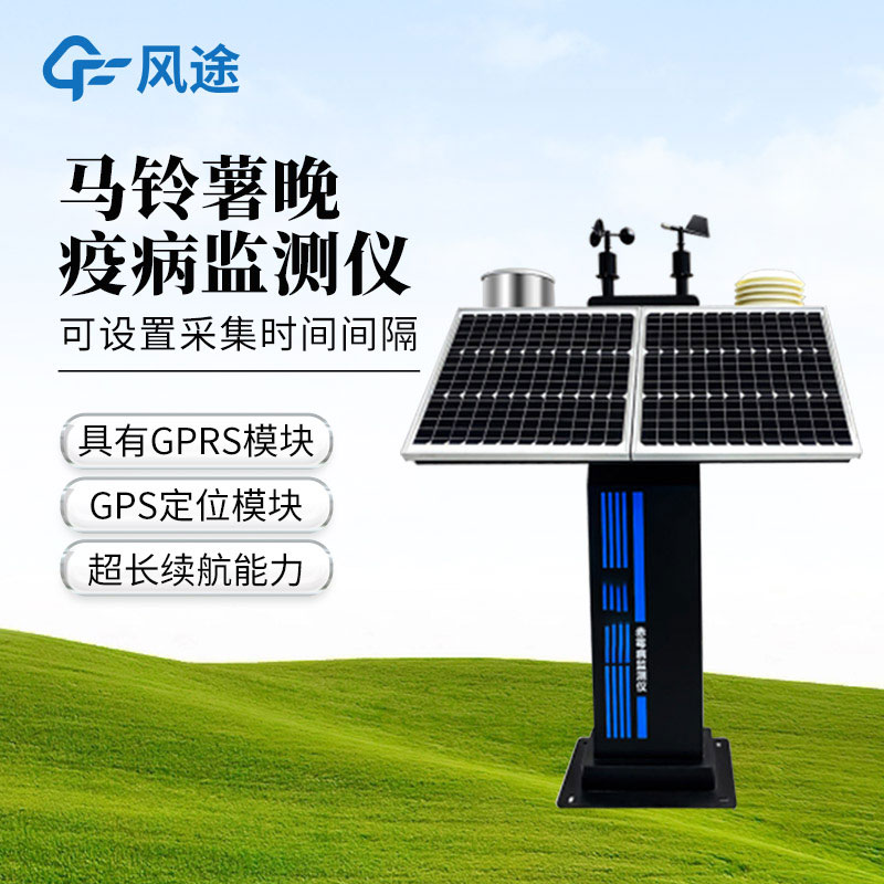 马铃薯晚疫病监测仪通过对风速、风向、雨量、空气温度、空气湿度、大气压等要素进行全天候现场监测。并通过4G无线传输至平台存储、分析。系统通过内置的晚疫病数据模型进行自动分析计算。可广泛应用于农业生产中。