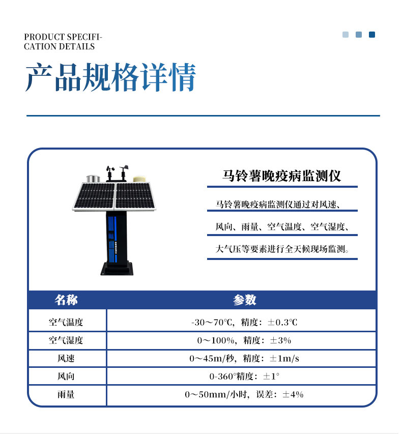 【产品简介】一、马铃薯晚疫病监测仪产品描述马铃薯晚疫病监测仪通过对风速、风向、雨量、空气温度、空气湿度、大气压等要素进行全天候现场监测。并通过4G无线传输至平台存储、分析。系统通过内置的晚疫病···