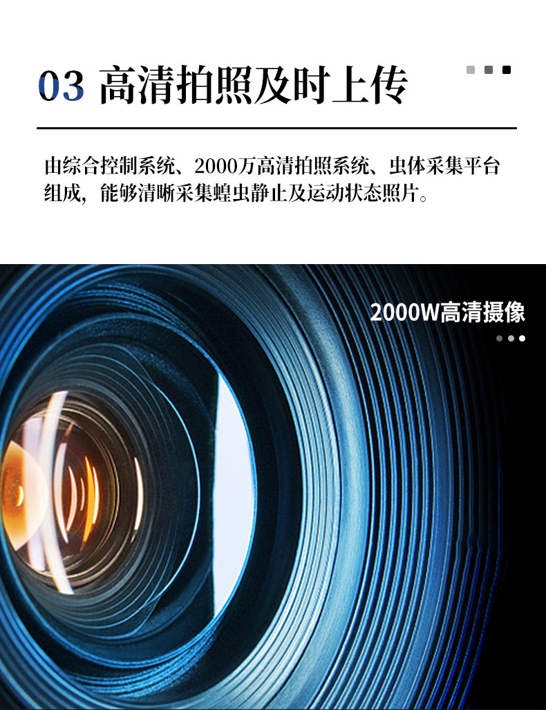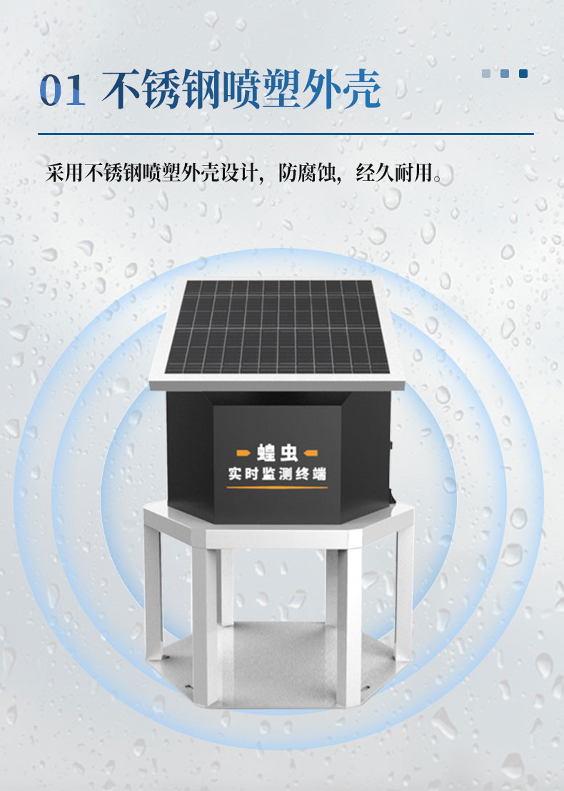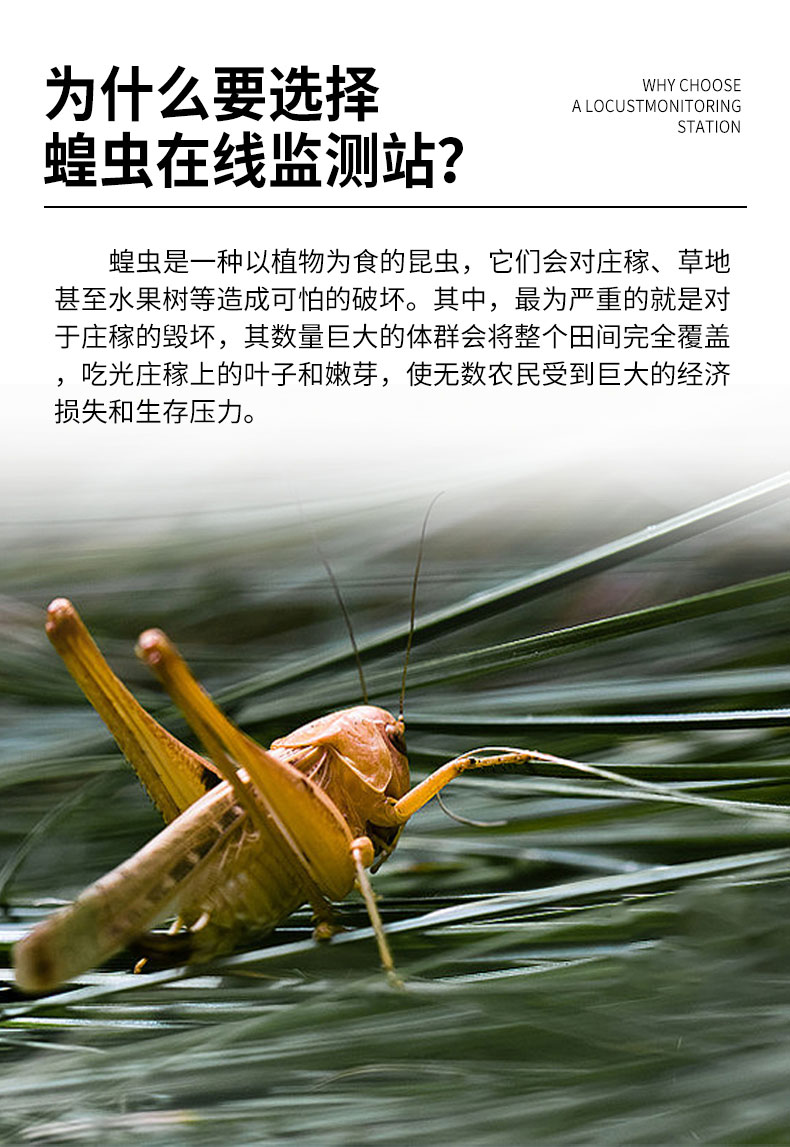 【产品简介】一、蝗虫实时监测预警站产品特点蝗虫实时监测预警站主要适用于蝗虫孳生区域,可通过光诱及性诱方式,采集与分析计算蝗虫种群密度、龄期特征等信息,支持时控功能,自动拍照,自动识别,可识别常···
